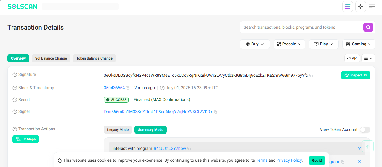 Example: You stake SOL on Marinade Finance. The transaction will show Stake as the type, and the staking program under Instruction.
